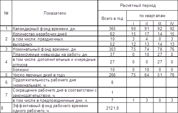 3.1 Расчёт баланса рабочего времени одного среднесписочного рабочего. Таблица 3.3Годовой баланс рабочего времени одного рабочего (при пятидневной неделе)