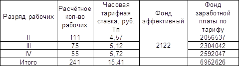 Трудоёмкость всей прод. = Трудоёмкость одного изд.*Vпроиз. (3.3) Ро = tp/ Фэф. *Квн, (3.4) где Ро – требуемое количество основных рабочих-сдельщиков, tp – расчётная трудоёмкость производственной программы Квн - планируемый коэффициент выполнения норм. Ро = 554000/2122*1,08 = 242 РIIо = 242*0,46 = 111,32 РIIIо = 242*0,31 = 75,02 РIVо = 242*0,46 = 55,66 3.3. Определение явочного числа работчих Р яв. =Q*Нвр./Т* Квн, (3.5) где Pяв. – необходимое число рабочих в смене; Q – объём работ в смену; Нвр. – норма времени на единицу изделия; Т – продолжительность смены для одного работника, ч. Q = Vпроиз/Фном. (3.6) Qм = 46000/303 = 151,8 Qп = 31000/303 = 102,3 Ряв.м. = 152*8/7,98*1,08 = 141 Ряв.п. = 102*6/7,98*1,08 = 71 Ряв. = Ряв.м. + Ряв.п. = 141+71 = 212 рабочих 3.3 Определение списочной численности работающих Рсп. = Ряв*Ксп., (3.7) где Рсп. – требуемое среднесписочное число рабочих Ксп. – коэффициент среднесписочного состава Ксп. = Фпл./ Фяв. (3.8) Ксп. = 303/266 = 1,139 Рсп. = 212*1,139 = 241 человек Численность вспомогательных рабочих (10% от численности основных): Рвсп. = 0,1*Ро = 0,1*242 = 24,2 = 24 чел. Р = Ро+Рвпом. = 242+24,4 = 266,2 = 266 чел. Чауп = 266*0,15/0,75 = 53 чел. Ч проч. персонала = 266*0,1/0,75 = 35 чел. 3.5 Расчёт фонда оплаты труда персонала предприятия Заработная плата по тарифу рабочих каждого тарифного разряда рассчитывается по формуле: Зтар = Тп*Тд*В*Ряв, (3.9) где Зтар – сумма заработной платы по тарифу; Тп - часовая тарифная ставка оплаты труда рабочих n-го разряда, руб; Тд – продолжительность рабочего дня, ч; В – количество выходов на работу одного рабочего в расчётном периоде. Тп =Т1*Кн, (3.10) где Т1 – тарифная ставка 1-го разряда; Кн – тарифный коэффициент n–го разряда (КнII=1,07 КнIII=1,2 КнIV=1,35). T1 = Тс / Кс, (3.11) где Тс – средняя тарифная ставка; Кс - средний тарифный коэффициент. Кс = ∑(Кн*ТРн)/∑ТРн, (3.12) где ТРн – трудоёмкость работ, имеющих одинаковые разряды. Кс = (1,07*554000*0,46+1,2*554000*0,31+1,35*554000*0,23)/554000= 650784/554000=1,17 Т1 = 5/1,17 = 4,27 ТпII = 4,27*1,07 = 4,57; ТпIII = 4,27*1,2 = 5,12; ТпIV = 4,27*1,35 = 5,76. ЗтарII = 4,57*7,98*266*212 = 2056537 ЗтарIII = 5,12*7,98*266*212 = 2304042 ЗтарIV = 5,76*7,98*266*212 = 2592047 Приработок к заработной плате по тарифу рассчитывается по формуле: Nсу = Зтар*(Квн-1), (3.13) где Nсу – сумма сдельного приработка. Nсу = 6952626*(1,08-1) = 556210 Суммы премиальных доплат определяются по формуле: Зпр = Зсд*Ппр/100 (3.14) Зпр = 6952626*20/100 = 1390525 Таблица 3.5 Расчёт фонда заработной платы