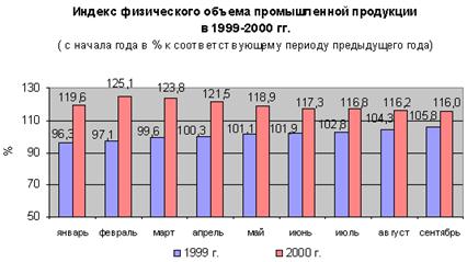 6. Наука и культура На начало 1998-1999 учебного года подготовку специалистов с высшим образованием осуществляло 18 государственных высших учебных заведений (в том числе филиалы) и 3 негосударственных вуза (Пермский гуманитарно-технологический институт, Уральский гуманитарный институт, Западно-Уральский институт экономики и права) и один филиал негосударственного вуза. В государственных вузах обучается 48,2 тыс. человек, в негосударственных - 1156 человек Система среднего профессионального образования Пермской области включает 80 учебных заведений различной ведомственной принадлежности и формы собственности, в том числе 66 государственных и муниципальных средних профессиональных учебных заведений (СПУЗ), из них 23 колледжа, 4 структурных подразделения ВУЗов, 4 филиала СПУЗов, 6 негосударственных образовательных учреждений. Наука в Пермской области представлена всеми основными секторами: академическим (институты УрО РАН и Российская академия сельскохозяйственных наук), отраслевым (отраслевые научно-исследовательские, проектные и проектно-изыскательские организации, конструкторские подразделения промышленных предприятий), вузовским (научно-исследовательские сектора или отделы, центры, ОКБ высших учебных заведений). Культурные заведения Пермской области: Музей деревянного зодчества "Хохловка", Пермский государственный академический театр оперы и балета им. П.И.Чайковского, Пермский драматический театр, Галерея, Театр Арлекин, Пермский краеведческий музей, Областная библиотека имени А.М.Горького, Пермский государственный цирк, Республиканский ипподром, ряд дворцов культуры. 7. Уровень жизни населения Денежные доходы на душу населения в отчетном месяце 2126,4 рублей Прожиточный минимум населения в отчетном месяце 961,9 рублей Численность безработных на конец периода 13,3 тыс. человек Уровень безработицы - 0,9% 8. Индекс физического объема промышленной продукции В январе-сентябре 2000 г. в Пермской области сохранялся рост объемов промышленного производства.