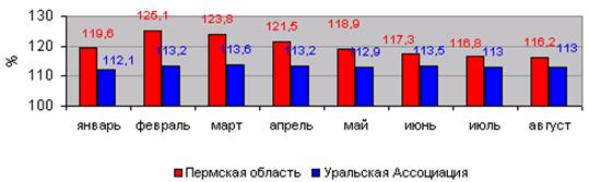 Положительные результаты сохранялись в социальной сфере - увеличился оборот розничной торговли, возросли реальные доходы населения. Промышленность В январе-сентябре т. г. промышленными предприятиями области произведено продукции в фактических отпускных ценах на сумму 78,8 млрд. рублей. Объем продукции крупных и средних промышленных предприятий составил 74,1млрд. рублей. Индекс физического объема произведенной продукции по всей промышленности в январе-сентябре т.г. составил к уровню соответствующего периода прошлого года 116,0 % , по крупной и средней промышленности - 115,5 процента. Темпы производства продукции превысили показатели прошлого года во всех отраслях промышленности области. Наибольший прирост объемов продукции в сопоставимой оценке отмечен в машиностроении и металлообработке, черной металлургии, химии и нефтехимии, промышленности строительных материалов, легкой промышленности. С начала года предприятия области увеличили объемы производства электроэнергии, дизельного топлива, бензина автомобильного, стали, проката, азотных удобрений, крупных электромашин, буровых установок, бронекабеля и провода обмоточного, лакокрасочных материалов, деловой древесины, древесностружечных плит, фанеры, картона, бумаги, цемента, стеновых материалов. Из товаров народного потребления увеличилось производство шелковых тканей, трикотажных и швейных изделий, обуви, телефонных аппаратов. Увеличилось производство мяса, колбасных изделий, кондитерских и макаронных изделий. Сельское хозяйство Объем продукции сельского хозяйства области во всех категориях хозяйств в действующих ценах составил 12,7 млрд. рублей, что в сопоставимой оценке на 2,8 % меньше, чем в январе-сентябре 1999 г. Уменьшение объемов валовой продукции сельского хозяйства произошло в основном за счет снижения урожайности картофеля и овощей в личных подсобных хозяйствах. В январе-сентябре т.г. производителями сельскохозяйственной продукции реализовано на убой 93,3 тыс. тонн скота и птицы (106,1 % к уровню соответствующего периода 1999 г.), получено 677,9 млн. штук яиц (101,8 %), молока произведено 510,4 тыс. тонн (96,0 %). По состоянию на 1 октября т.г. в сельскохозяйственных предприятиях области убрано 543,3 тыс. га зерновых культур (116,4 % к уровню на 01.10.1999г.). Валовой сбор зерна (в первоначально оприходованном весе) составил 644,4 тыс. тонн (128,5 % к уровню на 01.10.1999г.). 9. Рейтинг Пермской области среди республик и областей Уральского региона в январе-августе 2000 года Экономическая ситуация регионов Уральской ассоциации в январе-августе характеризуется развитием положительных тенденций, сложившихся в отраслях реального сектора и в инвестиционной сфере. За восемь месяцев прирост объема промышленного производства на Урале составил 13 % к соответствующему периоду 1999 года, в том числе по крупным и средним предприятиям 12,5 процентов. Рост производства отмечен во всех отраслях промышленности. В территориальной структуре промышленного производства Урала в январе-августе Пермской области принадлежало 5 место. В сравнении с другими территориями наиболее высокое значение ИФО промышленного производства отмечалось в промышленности строительных материалов области – 139, 8 %.