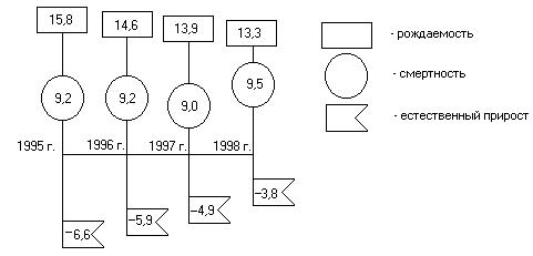 Коэффициенты естественного движения населения Пермской области за 1995-1998 гг.:
