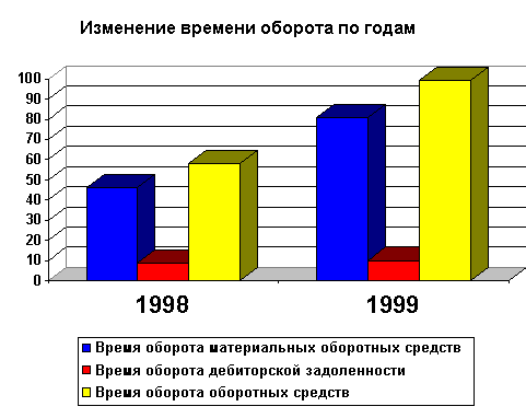 Из данных таблицы видно, что произошло снижение оборачиваемости всех приведённых показателей. Оборачиваемость дебиторской задолженности уменьшилась по сравнению с 1998 годом с 42,9 оборотов в год до 36,3 оборотов, то есть по сравнению с предыдущим годом погашение дебиторской задолженности происходило более медленными темпами. Время оборота дебиторской задолженности составляет 8,5 дней в 1996 и 10 дней в 1999 году. Это говорит о том что дебиторская задолженность погашается достаточно быстро. Изменение времени оборота по годам представлено на рисунке 1. Более существенно уменьшилась оборачиваемость материальных оборотных средств с 7,9 оборотов в 1998 году до 4,5 оборотов в 1999 году. Соответственно время оборота увеличилось до 86,5 дней. Уменьшение оборачиваемости в 1999 году произошло за счёт затруднений со сбытом продукции, которые в свою очередь вызваны неэффективностью управления запасами; недостаточным исследованием фирмой рынков сбыта своей продукции и возможностей расширения каналов сбыта.