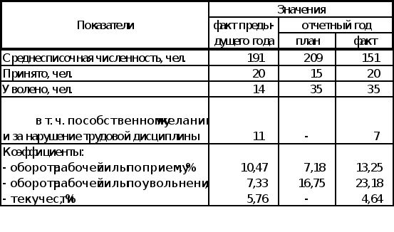 Коэффициент оборота рабочей силы по приёму увеличился на 6,07% по сравнению с плановым и на 2,78% по сравнению с предыдущим годом, а оборот рабочей силы по увольнению также увеличился на 6,43% по сравнению с плановым и на 15,85% по сравнению с предыдущим годом, на что следует обратить внимание, так как увеличение коэффициента общего оборота рабочей силы может быть следствием ухудшения условий труда. Наряду с этим положительной тенденцией является уменьшение коэффициента текучести на 1,12% по сравнению с предыдущим годом, это могло произойти за счет улучшения трудовой дисциплины и уменьшения количества увольнений по собственному желанию.