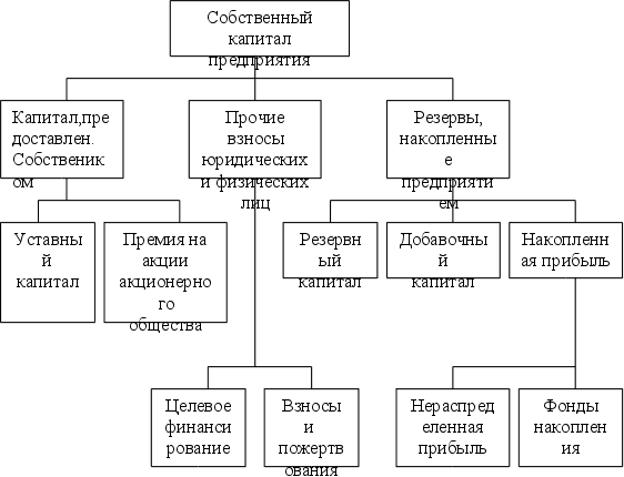 Собственные привлеченные финансовые ресурсы - это базовая часть всех финансовых ресурсов предприятия, которая базируется на момент создания предприятия и находится в ее распоряжении на всем протяжении ее жизни. Эта часть финансовых ресурсов - уставный фонд или уставнй капитал предприятия. Уставной капитал формируется за счет выпуска и последующей продажи акций (обыкновенных, привилегированных). За время жизни предприятия его уставной капитал может дробиться, уменьшаться и увеличиваться, в том числе за счет части внутренних финансовых ресурсов предприятия. Структура собственного капитала предприятия представлена на рис.1. Источниками собственных финансовых ресурсов являются :