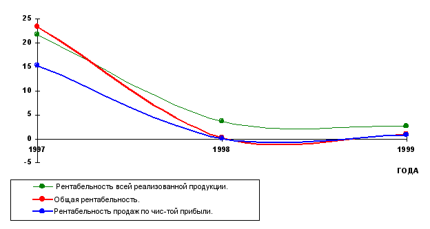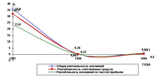 Рис 3. Изменение показателей рентабельности продукции за 1997-1999 г. На основе расчётов можно сделать следующие выводы. Показатель общей рентабельности за отчетный период вырос с 0,19 в 1998 до 0,97 в 1999 году, то есть увеличился в 5 раз. Это говорит о том, что в 1999 году каждый рубль реализации приносил в среднем около 1 копейки балансовой прибыли. Надо отметить резкое снижение данного показателя по сравнению с 1997 годом, когда он составлял 23,3% и упал за 1996 год до 0,19 (т.е. на 23,11%). Показатель рентабельности продаж по чистой прибыли также вырос в 1999 году с 0,14 на начало года до 0,8 на конец отчетного периода. Это говорит о том, что спрос на продукцию несколько возрос. Таким образом в 1999 году на 1 руб. реализованной продукции предприятие имело лишь 0,8 копеек чистой прибыли. Рентабельность всей реализованной продукции снизилась за отчетный период на 1% и составила к концу 1999 года 2,6%. Это значит, что в конце отчетного периода каждый рубль реализации стал приносить на 1 копейку меньше прибыли от реализации. Как видно из выше сказанного, все показатели рентабельности продукции очень низкие. В 1998 г. вследствие снижения спроса на продукцию леспромхоза из-за неплатежеспособности большинства потребителей, а также вследствие получения убытков от внереализационных операций показатели рентабельности продукции существенно снизились. 2.Рентабельность вложений предприятия. Рентабельность вложений предприятия- это следующий показатель рентабельности, который показывает эффективность использования всего имущества предприятия. Среди показателей рентабельности предприятия выделяют 5 основных: 1.Общая рентабельность вложений, показывающая какая часть балансовой прибыли приходится на 1 руб. имущества предприятия, то есть насколько эффективно оно используется. 2.Рентабельность вложений по чистой прибыли; 3.Рентабельность собственных средств, позволяющий установить зависимость между величиной инвестируемых собственных ресурсов и размером прибыли, полученной от их использования. 4.Рентабельность долгосрочных финансовых вложений, показывающая эффективность вложений предприятия в деятельность других организаций. 5.Рентабельность перманентного капитала. Показывает эффективность использования капитала, вложенного в деятельность данного предприятия на длительный срок. Необходимая информация для расчёта представлена в табл. 13. Таблица 13 Показатели для расчёта рентабельности (руб.)