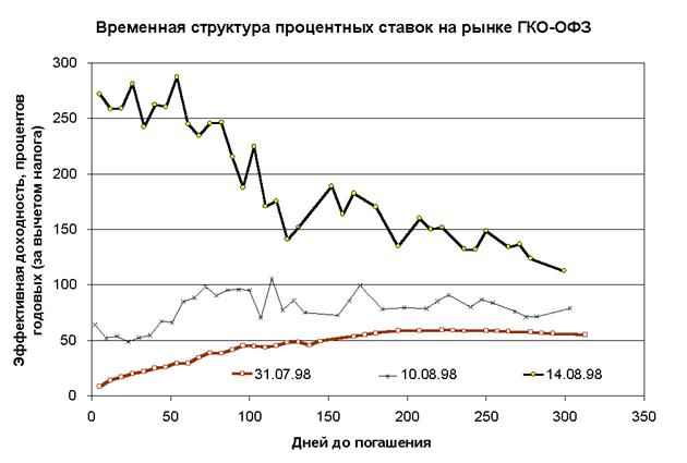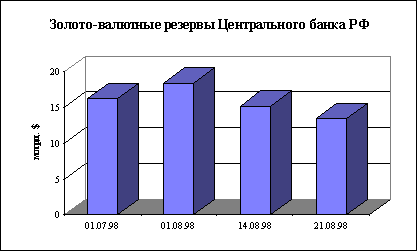 Рис. 1 Кризис на мировых финансовых рынках, начавшийся в конце октября прошлого года, не только оказал существенное негативное воздействие на российские финансовые рынки, но и отдалил наметившийся экономический рост, снижение темпов инфляции и уровня процента в экономике. Однако важно подчеркнуть, что основной причиной разрастания финансового кризиса в России стала внутренняя слабость экономики, политическая нестабильность, отсутствие конкретной экономической программы, а не внешние причины, послужившие лишь спусковым крючком разрушительных процессов. Среди проявлений финансового кризиса в России, особенно обострившегося к августу 1998 года, можно назвать следующее. 1. Снижение доверия как внешних, так и внутренних инвесторов к Правительству, Центральному банку и Министерству финансов России. Прежде всего, это означает утрату возможностей занимать деньги как на внешних, так и на внутренних рынках, а также отток зарубежных инвестиций и, как следствие, дальнейшее отдаление перспектив экономического роста. 2. Резкое снижение уровня цен на рынке государственных долговых обязательств и последующее принудительное переоформление ГКО-ОФЗ в долгосрочные низкопроцентные бумаги, по сути означающее дефолт государственных обязательств. 3. Быстрая девальвация национальной валюты, стабильность которой являлась стержневым условием всего предыдущего курса макроэкономической стабилизации. 4. Резкое ускорение инфляционных процессов в экономике как следствие повышения цен на импортную продукцию, составляющую значительную долю всего российского потребления и бегства от рублей в условиях девальвации. 5. Закрытие как внешних, так и внутренних источников финансирования дефицита государственного бюджета вследствие беспрецедентных мер Правительства по существу означают переход к инфляционному характеру финансирования и возвращение к практике кредитования Центробанком Правительства России или достижение бездефицитного бюджета. Это, в свою очередь, повысит темпы роста денежной массы и неизбежно скажется на росте потребительских цен, курсе доллара и общем ослаблении жесткости денежно-кредитной политики. 6. Крах отечественного банковского сектора, происходящего не только из-за потерь на финансовых рынках, но и из-за самого факта ликвидации важнейшего источника получения доходов - рынка ГКО-ОФЗ. Специфика отечественной финансовой системы состояла в ее крайней зависимости от пирамиды государственных ценных бумаг. Таким образом, дефолт на данном рынке в отсутствие других надежных источников дохода у коммерческих банков (например, кредитов в реальный сектор) привел к обострению кризиса неплатежей по всей стране, осуществляемых банковской системой. 7. Дефолт на рынке ГКО-ОФЗ, серьезно ухудшивший финансовое состояние большинства российских банков, практически разрушил межбанковский кредитный рынок. В целях выживания банки объединились в несколько групп, однако, и это не станет панацеей, поскольку несмотря на то, что крупному финансовому институту или группе легче получить кредит, западные банки вряд ли станут кредитовать наш западный сектор. 8. Обвал на российском рынке акций, отразивший реальную привлекательность портфельных инвестиций в российский корпоративный сектор. Индекс РТС-1 с начала октября 1997 года (максимальное