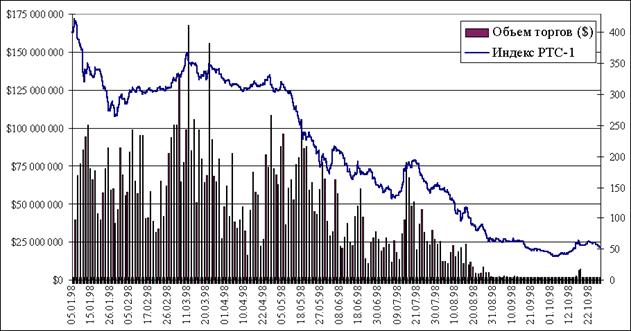 В конце сентября–начале октября 1998 г. российский рынок акций вновь продемонстрировал минимальный за последние два года уровень цен. В сентябре индекс РТС-1 снизился до уровня 43,81 пунктов, т.е. на 33,2%. 2 октября поставил очередной рекорд: индекс РТС-1 снизился до значения 37,74. Таким образом, с конца 1997 г. по начало октября падение российского индекса составило 90,5% (рис. 7).