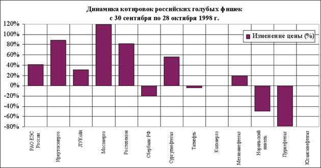 Тем не менее, в октябре тенденция падения цен сменилась на противоположную. К 26 октября индекс РТС-1 вырос почти на 40% до уровня 60 пунктов. По состоянию на 28 октября цены наиболее ликвидных акций продемонстрировали рост. Так, например акции АО "Мосэнерго" выросли на 120%, АО "Иркутскэнерго" – на 89%, АО "Ростелеком" – на 82%, АО "Сургутнефтегаз" – на 56%, РАО "ЕЭС России" – на 41%, АО "ЛУКойл" – на 31% (рис. 8).