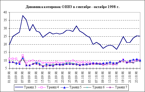 В августе 1998 года индекс РТС-1 стабильно снижался по тенденции, заданной еще с середины июля. За месяц его падение составило около 55%. Всего за 1998 год индекс РТС-1 снизился примерно на 83%, а с октября 1997 года - на 90%. Факторы, повлиявшие на существенное сокращение цен российских акций можно условно разбить на две группы. К первой группе относятся фундаментальные факторы подробно рассмотренные выше. Касательно рынка акций можно лишь добавить следующее. Во-первых, острый кризис в российской финансовой и банковской системе неизбежно приведет к снижению таких макроэкономических показателей как объем инвестиций, ВВП и объем промышленной продукции и т.д. Технологическая взаимосвязь предприятий различных секторов может привести к углублению экономического спада, в условиях которого рассчитывать на заметный рост акций не приходится. Во-вторых, усилившаяся политическая и социальная напряженность резко повысила вероятность прихода к власти левых сил, в намерения которых входит новый передел собственности на государственном уровне. Это делает более разумным выжидательную позицию по отношению к инвестициям в рынок российских акций. Вторую группу факторов, повлиявших на падение цен акций и индекса РТС-1 можно назвать технической. Во-первых, при существенно снизившемся объеме торгов и полном отсутствии спроса на бумаги, очередной крупный заказ на продажу бумаг существенно снижает цены и, соответственно, индекс РТС-1. Последнее, в свою очередь, психологически воздействует на контрагентов, приводя к дополнительным заказам на продажу акций. Во-вторых, существенно снизившееся доверие участников рынка между собой привело к тому, что крупные компании и банки предпочитают не работать с небольшими компаниями без осуществления предоплаты при продаже или предпоставки при покупке акций. Такая ситуация, по существу, означает снижение ликвидности рынка, что всегда негативно воздействует на уровень цен. Острый финансовый кризис на российских финансовых рынках и дефолт государственных обязательств крайне негативно сказался и на конъюнктуре международных рынков. Опасность повторения сходных сценариев на других emerging markets является с одной стороны причиной, а с другой - следствием оттока капитала с рискованных рынков. Кроме того, развитые рынки также оказались подверженными данному влиянию в силу международного характера диверсификации портфелей крупнейших инвестиционных банков, акции которых имеют определенный вес в зарубежных фондовых индексах. Динамика котировок российских валютных государственных ценных бумаг в сентябре – октябре 1998 г. находилась под сильным влиянием политических процессов в России и развитием процесса переговоров между Правительством РФ и иностранными инвесторами в отношении реструктуризации рублевых государственных ценных бумаг (ГКО и ОФЗ), замороженных августовскими решениями Правительства и ЦБ РФ. В конце сентября 1998 г. возобновилась тенденция к падению котировок ОВВЗ, в особенности это затронуло 3-ю серию со сроком погашения в марте 1999 г. (см. рис. 5). К середине октября ее цена упала с 25–30 до 17–20 процентов от номинала. Однако с середины месяца наметился некоторый рост котировок. В частности, к концу октября 1998 г. данный транш ОВВЗ котируется на уровне 25% от номинала, тем не менее с учетом близости срока ее по