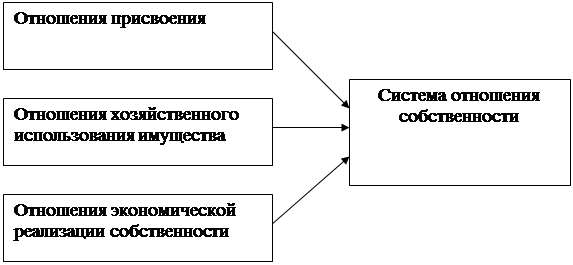 Рис. 1 Структура отношений собственности. Присвоение – экономическая связь между людьми, которая устанавливает их отношения к вещам, как к своим. Такая связь уходит своими корнями в производственный процесс. Ведь любое производство материальных благ есть по существу ни что иное, как присвоение людьми природного вещества и энергии в целях удовлетворения своих потребностей. Отсюда можно сделать вывод: если присвоение не возможно без производства, то и последнее всегда протекает в рамках определенной собственности. Присвоение может сочетаться с прямо противоположным отношением – отчуждением. Оно возникает, например, если какая-то часть общества захватывает все средства производства, а другая часть остается без всяких источников существования. Или когда продукты созданные одними людьми, без всякого возмещения присваивают другие. Такими были, скажем, взаимоотношения между феодалами и крепостными крестьянами, занятыми подневольным трудом на барщине. Собственники средств производства не всегда сами занимаются созидательной деятельностью: они дают другим предприимчивым людям возможность употреблять их имущество в хозяйственных целях на определенных условиях. Тогда между собственниками и предпринимателем возникают отношения хозяйственного использования имущества. Последний получает реальную возможность временно владеть и пользоваться объектом чужой собственности. Примером отношений хозяйственного использования чужой собственности служит аренда – договор о предоставлении имущества какого-то человека во временное пользование другому лицу за определенную плату. Собственность экономически реализуется, если приносит доход её владельцу. Такой доход представляет собой весь вновь созданный продукт или его часть, которые получены благодаря применению труда и средств производства. Это, может быть, скажем, прибыль, налог, различного рода платежи. В случае аренды назначается арендная плата, которая включает в себя процент на капитал, вложенный в имущество его собственником, и часть прибыли (дохода), которая получена от использования взятого в аренду имущества. При заключении концессии заранее устанавливаются платежи или определяется доля прибыли, которую временные хозяева уплачивают собственнику. Это означает, что система экономических отношений собственности охватывает – от начала и до конца – весь хозяйственный процесс. Она пронизывает и составляет сердцевину всех отношений между людьми по производству, распределению, обмену и потреблению благ и услуг. Движимый собственническими интересами, человек может вступать в конфликт с интересами всего общества. В этом случае государство и право предотвращают противоречия, порождаемые собственностью, и регулируют поведение агентов производства. При определении собственности в юридическом смысле выделяются различные категории собственников принадлежащего им имущества. Так, согласно Гражданскому кодексу Российской Федерации, субъектами права собственности являются (статья 212): А) гражданин (физическое лицо) – человек как субъект гражданских (имущественных и неимущественных) прав и обязанностей; Б) юридическое лицо – организация, являющаяся субъектом гражданских прав и обязанностей. Примером может служить фирма – хозяйственное промышленное или торговое п