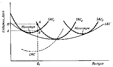 Puc.9. График долговременных средних и предельных издержек Взаимосвязь между краткосрочными и долговременными издержкамиПредположим, фирма не уверена в будущем спросе на свою продукцию и рассматривает три альтернативных варианта размеров предприятия. Линии краткосрочных средних издержек по трем вариантам даны как SAC1, SAC2 и SAC3 на рис. 10. Решение имеет огромное значение, поскольку после того, как предприятие построено, его размеры невозможно изменить в течение некоторого времени.