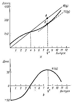 Рис. 11. График долговременных и краткосрочных издержек производства при увеличивающемся и сокращающемся эффекте масштаба Что показывает линия долговременных издержек фирмы? На долговременном этапе фирма может изменить размеры своего завода таким образом, что, если первоначальный объем производства составлял Q1 и появилось желание увеличить выпуск продукции до Q2 или Q3, это может быть сделано без увеличения издержек производства. Кривая долговременных средних издержек представляет собой отмеченные перекрестными штрихами участки линии краткосрочных средних издержек, так как она показывает минимальные издержки производства для любого объема выпуска продукции. Кривая долговременных средних издержек является, таким образом, огибающей кривых краткосрочных средних издержек — она огибает краткосрочные кривые. Теперь предположим, что существует множественный выбор размеров завода, для каждого из которых имеется кривая краткосрочных средних издержек с минимумом на уровне 10 долл. Вновь кривые долговременных средних издержек будут огибать краткосрочные кривые. На рис. 10 это прямая линия LAC. Сколько бы ни решила производить фирма, она может выбрать размер производства, который позволяет ей осуществлять выпуск продукции с минимальными средними издержками в 10 долл. (так как эффект масштаба постоянный). При возрастающем или падающем эффекте масштаба анализ в основном такой же, но линия долговременных средних издержек не является больше горизонтальной. Рис.11 показывает типичный случай, при котором минимальные средние издержки являются самыми низкими для производства средних размеров. График долговременных средних издержек вначале отражает возрастающий эффект масштаба, но при увеличении объема производства этот эффект становится падающим. Опять-таки участки с поперечной штриховкой образуют огибающую, связанную с тремя вариантами производства Отметим, что кривая LAC никогда не поднимается выше любой кривой краткосрочных средних издержек. Заметим также, что точки минимальных средних издержек самого маленького и крупнейшего из предприятий не находятся на кривой долговременных средних издержек вследствие возрастающего и падающего эффекта масштаба на долговременном этапе. Выбор объема производства на краткосрочный периодКак следует выбирать руководителю фирмы, максимизирующей прибыль, объем выпуска продукции на краткосрочный период при фиксированном размере капитала? Здесь мы покажем, как фирма может использовать информацию о доходах и издержках, чтобы принять решение по объему выпуска продукции, максимизирующее прибыль. Максимизация прибылиНа краткосрочном отрезке времени фирма оперирует постоянным размером капитала и должна выбирать такой объем переменных факторов производства (труда и материалов), который максимизировал бы прибыль. Ввиду важности этого вопроса мы будем выводить объем выпуска продукции, максимизирующий прибыль, тремя различными способами: численным, графическим и алгебраическим. Таблица 4 содержит информацию о доходах и издержках фирмы. Фирма продает свою продукцию на конкурентном рынке по рыночной цене 40 долл. за единицу независимо от количества реализуемой продукции. Заметим, что доход фирмы растет пропорционально объему выпуска продукции, так как средний доход (т. е. цена) являетс