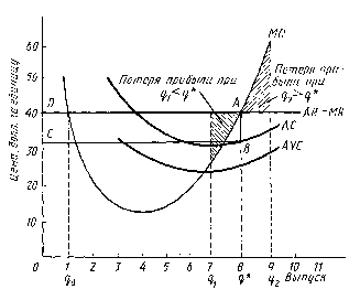 Рис. 13. График максимизации прибыли конкурентной фирмой Прибыль достигает максимума в точке А, связанной с объемом выпуска продукции q* = 8 и ценой в 40 долл., так как в данной точке предельный доход равен предельным издержкам. При более низком объеме производства (скажем, q1=7) предельный доход больше предельных издержек, и поэтому прибыль может быть дополнительно увеличена за счет увеличения выпуска продукции. Заштрихованная площадь между q1 = 7 и q* показывает потерянную прибыль, связанную с производством при q1. При более высоком объеме выпуска продукции (скажем, q2) предельные издержки выше предельного дохода. В этом случае сокращение объема выпуска продукции дает экономию издержек, превышающих предельный доход. Заштрихованная площадь между q* и q2 = 9 показывает потерянную прибыль, связанную с производством на уровне q2. Кривые MR и МС пересекаются как при объеме производства q0, так и при объеме q*. При q0, однако, прибыль явно не достигает максимума. Увеличение объема производства выше q0 увеличивает прибыль, так как справа от q0 предельные издержки значительно ниже предельного дохода. Поэтому условием максимизации прибыли является равенство предельного дохода предельным издержкам в точке, в которой кривая предельных издержек возрастает, а не снижается. Получение прибыли конкурентной фирмой в краткосрочном периодеРис. 13 показывает также прибыль конкурентной фирмы в краткосрочном периоде. Расстояние АВ представляет собой разницу между ценой и средними издержками при объеме выпуска продукции q* и равно средней прибыли на единицу выпуска продукции. Отрезок ВС измеряет общее количество произведенной продукции. Следовательно, прямоугольник ABCD отражает валовую прибыль. Фирме не всегда нужно максимизировать прибыль на краткосрочном отрезке, как показывает рис. 14. Главным отличием от рис. 13 являются увеличенные постоянные издержки производства. Это поднимает средние полные издержки, но не меняет кривых средних переменных и предельных издержек. При максимизирующем прибыль объеме производства q* цена Р меньше, чем средние издержки, и поэтому отрезок линии АВ равен средним убыткам производства. Аналогичным образом заштрихованный прямоугольник ABCD представляет убытки фирмы.