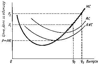 Рис. 14. График убытков конкурентной фирмы в краткосрочном периоде Почему же фирма, терпящая убытки, не прекращает производство? На краткосрочном отрезке фирма может работать с убытками, потому что она рассчитывает на получение прибыли в будущем по мере роста цены ее продукции или снижения издержек производства. Фактически в краткосрочном периоде перед фирмой стоит двоякий выбор: она может производить некоторое количество продукции или временно закрыть свое производство. Она выберет более прибыльную из двух альтернатив. В частности, фирма решит закрыть производство (ничего не выпускать), когда цена ее товара меньше минимальных средних переменных издержек. В данной ситуации прибыль от производства не покроет переменных издержек и убытки возрастут. Рис. 14 показывает случай, при котором выпуск продукции желателен. Объем производства q* минимизирует краткосрочные убытки. В данном случае дешевле произвести продукцию объемом q*, чем вообще не производить продукции, так как при q* цена превышает средние переменные издержки. Каждая произведенная единица продукции дает доход, превышающий издержки, и тем самым более высокую прибыль, чем если бы фирма не производила ничего. (Валовая прибыль, однако, остается все еще отрицательной величиной, так как постоянные издержки высоки.) Отрезок линии АЕ измеряет разницу между ценой и средними переменными издержками и прямоугольник AEFD — дополнительную прибыль, которая может быть получена при объеме производства, равном q*, а не нулю. Таким образом, конкурентная фирма не выпускает продукции, если цена меньше минимальных средних переменных издержек. Когда фирма производит продукцию, она максимизирует прибыль, выбирая такой объем производства, при котором цена равна предельным издержкам. При данном объеме выпуска продукции прибыль является положительной величиной, если цена выше средних валовых издержек. Фирма может действовать с убытками в краткосрочном периоде. Однако если фирма сталкивается с убытками и на долговременном этапе, она прекратит производство. Кривая краткосрочного предложения конкурентной фирмыКривая предложения фирмы показывает, какой объем продукции будет производить фирма при каждой возможной цене. Как мы видели, фирмы будут наращивать выпуск продукции до точки, при которой цена равна предельным издержкам, но свернут производство, если цена будет ниже средних переменных издержек. Следовательно, для ненулевого объема производства кривая предложения фирмы совпадает с той частью кривой предельных издержек, - которая лежит выше кривой средних переменных издержек. Так как кривая предельных издержек пересекает кривую средних переменных издержек в точке минимума последней, кривая предложения фирмы совпадает с кривой предельных издержек, лежащей выше точки минимальных средних переменных издержек. При любом Р, большем, чем минимум AVC, максимизирующий прибыль объем производства может быть рассчитан по графику. Например, на рис. 15 при цене P1 предложение составит q1, а при цене Р2 — q2. Если цена Р меньше (или равна) минимальных затрат AVC, максимизирующий прибыль объем производства равен нулю. На рис. 15 вся кривая предложения представляет собой поперечно заштрихованные участки вертикальной оси и кривой предельных издержек.