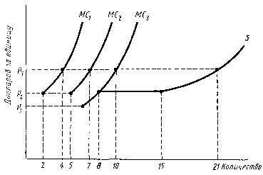 Рис. 15. Кривая краткосрочного предложения конкурентной фирмы Краткосрочные кривые предложения для конкурентных фирм возрастают по той же самой причине, что и предельные издержки, — из-за сокращающейся отдачи одного или нескольких факторов производства. В результате увеличение рыночной цены побуждает фирмы, уже находящиеся на рынке, увеличить объем производства. Более высокая цена делает дополнительное производство прибыльным, а также увеличивает валовую прибыль фирмы, так как она распространяется на всю произведенную фирмой продукцию. Кривая краткосрочного рыночного предложенияКривая краткосрочного рыночного предложения показывает объем выпуска продукции, осуществляемого отраслью промышленности в краткосрочном периоде при любой возможной цене. Объем производства отрасли — это суммарное предложение всех отдельных фирм. Следовательно, кривую рыночного предложения можно получить, складывая кривые предложений отдельных фирм. Рис. 16 показывает, как это сделать, когда имеются только три фирмы с различными краткосрочными издержками производства. Кривая предельных издержек каждой фирмы вычерчивается только в той части, которая лежит выше кривой средних переменных издержек. Для простоты взяты только три фирмы, но точно такой же анализ возможен и в случае большего числа фирм.