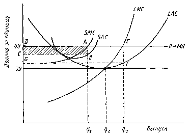Рис. 16. График изменения отраслевого предложения на краткосрочном отрезке Выбор объема производства на долговременном этапеНа долговременном этапе фирма может изменять все используемые факторы производства, включая размер предприятия. Она может свернуть производство (т. е. выйти из дела) или же производить новые виды продукции (т.е. войти в дело). Так как нас интересует конкурентный рынок, мы допускаем свободный вход и свободный выход из дела. Другими словами, мы предполагаем, что фирмы могут войти или выйти из дела без каких-либо законодательных ограничений или начальных, связанных со вступлением в дело, издержек, помимо прямых издержек производства и инвестиций в новые производственные фонды.
