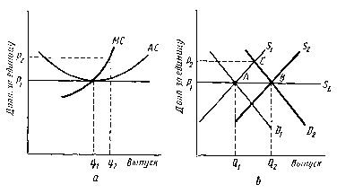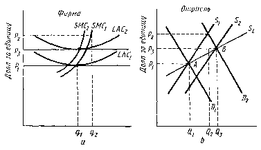 Рис. 18. График долговременного предложения в отрасли с постоянными издержками Часть (а) показывает, как данное повышение цены влияет на типичную фирму в отрасли. Когда цена поднимается до Р2, фирма в соответствии с кривой краткосрочных предельных издержек увеличивает объем производства до q2. Данный объем производства максимизирует прибыль, так как отвечает условию, что цена равна краткосрочным предельным издержкам. Если все фирмы реагируют таким образом, у каждой из них будет положительная прибыль в условиях краткосрочного равновесия. Такая прибыль привлекательна для вкладчиков капитала и заставит существующие фирмы расширить свою деятельность, а новые фирмы вступить на рынок. Итак, валовой объем производства отрасли возрастет. На рис. 18b краткосрочная кривая рыночного предложения смещается вправо, с S1 к S2. Это смещение вызывает движение рынка к новому долговременному равновесию на пересечении кривых D2 и S2. Так как данное пересечение является точкой долговременного равновесия, объем производства увеличится настолько, что прибыль станет равной нулю и у фирм пропадет стимул для вступления в отрасль или выхода из нее. В отрасли с постоянными издержками дополнительное использование факторов производства, необходимое для увеличения объема, не приводит к росту цен факторов производства. Это может произойти, например, если неквалифицированный труд является основным используемым фактором производства и зарплата на рынке неквалифицированного труда не зависит от роста спроса на трудовые ресурсы. Так как цены факторов производства не изменились, кривые издержек фирмы также остались без изменений. Новое долговременное равновесие будет в точке В на рис. 18b, где цена равна P1, т. е. первоначальной цене (до того, как произошло неожиданное увеличение спроса). Кривая долговременного совокупного предложения для отрасли с постоянными издержками является, следовательно, горизонтальной линией при цене, которая равна долговременным минимальным средним издержкам производства. При любой более высокой цене прибыль будет положительна, вступление на рынок расширится, увеличится краткосрочное предложение, и это приведет к снижению цены. Запомним, что в отрасли с постоянными издержками цены факторов производства не изменяются, когда изменяются условия на рынке продукции. Отрасли с постоянными издержками имеют горизонтальные кривые долговременных средних издержек. Отрасль промышленности с растущими издержкамиВ отрасли с растущими издержками цены некоторых или всех используемых в производстве факторов растут по мере того, как расширяется отрасль и растет спрос на эти факторы. Такая ситуация встречается, например, если в отрасли применяется квалифицированный труд, нехватка которого возникает при повышении на него спроса. Или фирме могут понадобиться минеральные ресурсы, имеющиеся только в определенных регионах, и поэтому стоимость земли как фактора производства возрастает вместе с объемом выпуска продукции. Рис. 19 показывает, как построить кривую долговременного совокупного предложения методом, аналогичным предыдущему построению кривой для отрасли с постоянными издержками. Отрасль первоначально находится в состоянии долговременного равновесия в точке А на рис. 19b. Когда кривая спроса неожиданно смещается с D1 к D2, цена прод