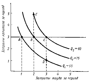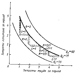 Рис.5. Формы изоквант Убывающая отдачаВ данном случае как по отношению к труду, так и по отношению к капиталу действует закон убывающей отдачи. Чтобы увидеть, почему, например, сокращается отдача от труда, проведем горизонтальную линию, фиксирующую использование капитала на определенном уровне, скажем 3 единицы. Подсчитывая данные об объеме выпуска продукции по каждой изокванте по мере роста трудозатрат, мы отмечаем, что каждая дополнительная единица труда дает все меньший и меньший прирост выпуска продукции. Таким образом, закон убывающей отдачи действует по отношению к труду как в долговременные, так в краткосрочные периоды. Увеличение использования одного фактора при фиксированном положении другого приводит ко все более и более низкому приросту выпуска продукции, а изокванта становится все круче по мере замещения труда капиталом и все более плоской, когда капитал замещается трудом. Закон убывающей отдачи действует и по отношению к капиталу. При фиксированных трудозатратах предельный продукт капитала снижается по мере роста капитала. Замещаемость производственных факторовУгловой коэффициент каждой изокванты указывает, каким образом происходит замещение одного фактора производства другим при сохранении постоянного объема продукции. Абсолютное значение углового коэффициента называется предельной нормой технологического замещения (MRTS). MRTS труда капиталом представляет собой величину, на которую может быть сокращен капитал за счет использования одной дополнительной единицы труда при фиксированном объеме выпуска продукции. MRTS всегда является положительной величиной. В математической форме: MRTS = - 5К/5L, где 5К и 5L представляют собой относительно небольшие изменения капитала и труда для отдельной изокванты (т. е. для постоянного Q). Заметим, что на рис. 6 предельная норма технологического замещения (- 5K/5L) равна 2, когда затраты труда увеличиваются с 1 единицы до 2 и выпуск продукции фиксируется на уровне 75 единиц. Однако MRTS снижается до 1, когда затраты труда возрастают с 2 до 3, а впоследствии уменьшаются с 2/3 до 1/3. Ясно, что чем больше труда замещается капиталом, тем менее производительным становится труд, а использование капитала становится относительно более эффективным. Поэтому чтобы сохранить постоянным объем выпуска продукции, необходимо сократить минимальное количество капитала, в этом случае изокванта приобретает более плоскую форму.