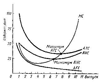 Средние издержки (АС). Средние издержки являются издержками на единицу выпуска продукции. Имеются три вида средних издержек: средние постоянные, средние переменные и средние валовые издержки. Средние постоянные издержки (AFC) представляют собой постоянные издержки, деленные на объем выпуска продукции (FC/Q). Так как постоянные издержки не изменяются, средние постоянные издержки снижаются по мере увеличения объема выпуска продукции. Средние переменные издержки (AVC) представляют собой переменные издержки, деленные на объем выпуска продукции (VC/Q). Наконец, средние валовые издержки (АТС) представляют собой валовые издержки, деленные на объем выпуска продукции (TC/Q). В целом средние валовые издержки представляют собой издержки производства единицы продукции. Сравнивая средние валовые издержки с ценой продукта, мы можем определить, прибыльно ли производство. Факторы, определяющие причину краткосрочных издержекКак видно из данных табл. 3, переменные и валовые издержки растут вместе с выпуском продукции. Скорость, с которой эти издержки увеличиваются, зависит от природы производственного процесса, и в частности от степени, в которой производство подвержено действию закона убывающей отдачи по отношению к переменным факторам. По отношению к труду данный закон действует, когда сокращается предельный продукт труда. Если труд является единственным переменным фактором, что происходит при увеличении объема выпуска продукции? Чтобы больше производить, фирма должна нанять больше рабочих. Тогда, если предельный продукт труда быстро снижается по мере увеличения трудозатрат (из-за действия закона убывающей отдачи), для ускорения выпуска продукции необходимы все большие и большие издержки. В итоге переменные и валовые издержки быстро растут одновременно с увеличением объема выпуска продукции. С другой стороны, если предельный продукт труда незначительно снижается при увеличении количества используемых трудовых ресурсов, издержки будут возрастать не столь быстро при увеличении объема выпуска продукции. Характер кривых издержек производстваНа рис. 7 показана группа непрерывных кривых, которые приблизительно отражают данные о предельных и средних издержках, приведенных в табл. 3. Постоянные издержки составляют 50 долл. В итоге кривая средних постоянных издержек AFC непрерывно снижается от 50 долл. до нуля. Форма остальных зависимостей краткосрочных издержек определяется соотношением кривых предельных и средних издержек. Когда предельные издержки ниже средних, кривая средних издержек идет вниз. Когда предельные издержки выше средних, кривая средних издержек идет вверх. Когда средние издержки минимальны, предельные издержки равны средним.