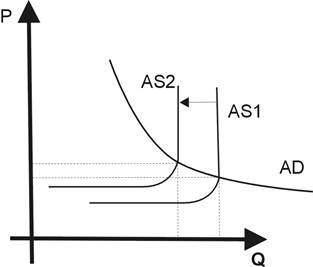 Увеличение издержек производства приводит к смещению кривой предложения влево. Это отражает увеличение издержек на единицу продукции, возрастают цены и сокращается объем реального валового национального продукта. Причиной инфляции спроса является увеличение платежеспособности спроса на товары, по сравнению с его прежней величиной. В самом общем плане инфляция спроса означает нарушение равновесия между совокупным спросом и совокупным предложением со стороны спроса. Покажем инфляцию спроса на графике: