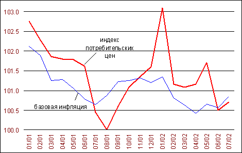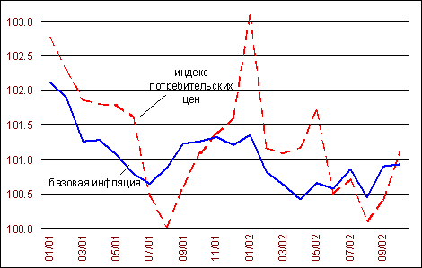Таблица: http://www.forecast.ru/mainframe.asp В октябре рост потребительских цен заметно ускорился. Он составил 101.1% против 100.4% в сентябре и 100.1% в августе. Есть основания говорить об усилении инфляционных процессов, выходящем за рамки действия сезонного фактора. Базовая инфляция в октябре составила 100.9%1 против 100.5-100.6% в среднем во втором-третьем кварталах текущего года (см. график).