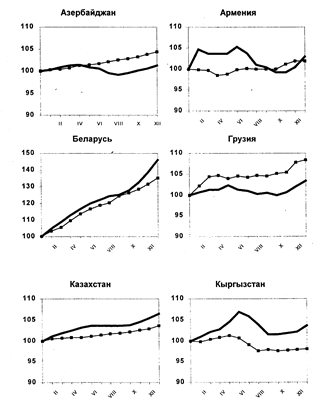 В целом связь между денежной массой и динамикой цен еще должным образом не формализована, пока можно говорить о том, что растут параллельно оба показателя. Но это слишком общая зависимость, чтобы из нее выводить однозначные причинные связи. Наиболее приемлемое истолкование состоит в том, что эти величины взаимно влияют друг на друга, причины и следствия меняются местами. Все зависит от того, какая из двух классических сторон больше влияет на уровень цен: предложение, т.е. предприятия-производители, монополисты-продавцы, либо спрос, т.е. покупатели, получившие доходы, не связанные с производством товаров и услуг. В России, скорее всего, оба этих фактора действуют одновременно, но преобладает, видимо, предложение представленное продавцами-монополистами. Поэтому и отставание денежной массы от динамики цен в течение всей либерализационной реформы, начиная с 1992 г., не препятствует инфляции. Реформаторы немонетаристскую инфляцию (инфляцию предложения) стали укрощать монетаристскими методами, зажимая денежную массу и ограничивая платежеспособный спрос, что и вызвало резкое падение производства, ибо всякому монополисту проще и выгоднее сокращать производство и повышать цены, чем наращивать его объемы и снижать цены. Вот это несоответствие природы российской инфляции и метода «борьбы» с нею и составляет главную особенность инфляционной ситуации в стране.
