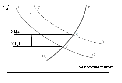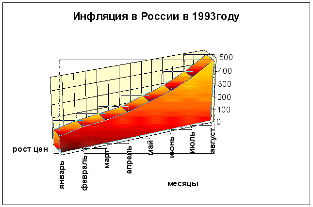 Все эти три причины взаимосвязаны и каждая из них может вести к росту или падению спроса и предложения, нарушая их баланс. Значение источников инфляции важно для выработки конкретных мер борьбы с инфляцией. 2.5.Инфляция спроса. Инфляция спроса – это результат увеличение совокупного спроса, из–за которого кривая совокупного спроса сдвигается вправо с одновременным повышением уровня всех цен. В такой ситуации экономика будет работать как бы выше уровня полного использования (полной занятости) всех производственных ресурсов. Но поскольку реально это невозможно, то возникает ситуация кратковременного (поначалу) завышения оценки обществом товаров и услуг, произведенных из имеющихся ресурсов. В дальнейшем ситуация будет развиваться следующим образом: Р Допустим, что экономика близка к полной занятости и загруженности производственных мощностей. Рост расходов населения, предприятий и государства на потребление смещает кривую совокупного спроса вверх из положения СС в положение СС1 (рис.1). Соответственно, наблюдается и рост цен, положение которых в конечном итоге зафиксируется на уровне УЦ» . 2.6. Инфляция предложения. Наряду с инфляцией спроса существует и инфляция предложения. Инфляция предложения – это результат кратковременного снижения совокупного предложения, которое ведет к сдвигу влево кривой предложения и повышению уровня цен из-за усилившегося дефицита многих товаров. Инфляция предложения означает рост цен, спровоцированный увеличением издержек производства в условиях недоиспользования производственных ресурсов. Повышение издержек на единицу продукции сокращает прибыли и объем продукции, которое предприятия готовы предложить при существующем уровне цен. В результате уменьшается предложение товаров и услуг, увеличиваются цены. Следовательно, не спрос, а издержки взвинчивают цены. Основными источниками инфляции предложения являются рост издержек вследствие роста заработной платы и за счет роста цен на сырье и энергию. (2,284)Этот тип инфляции имеет место в России. Инфляция предложения приобретает особенно неприятные формы в тех случаях, когда предложение изменяется особенно резко. Речь идет о неурожаях, внезапных взлетах цен на сырье и т.п. Например, в 1973 – 1974 гг. произошел драматический скачок мировых цен на нефть, что привело к резкому ускорению инфляции в огромном числе стран. Такие события называют шоками предложения, и они способны чрезвычайно обострить инфляционные проблемы. На практике, часто одновременно, имеют место инфляция спроса и инфляция предложения. 3. Процессы инфляции в России. 3.1. Инфляция 1992-1993гг. и ее причины. 0 развитии инфляционных процессов в России невозможно говорить без обращения к цифрам, показывающим темпы этой инфляции. А эти цифры говорят о том, что в 1993 г. страна подошла очень близко к грани гиперинфляции, хотя в отдельные месяцы растущее движение цен и удавалось несколько замедлить. При этом надо помнить, что здесь мы имеем дело с ростом цен, происходящим по модели сложных процентов, в силу чего общее повышение цен оказывается куда большим, чем просто сумма повышений цен за указанные выше месяцы. Итого вый рост цен за 8 месяцев 1993 г. показан на диаграмме 1. Д Нижеприведенная таблица 1 характеризует темпы роста цен в 1993г.