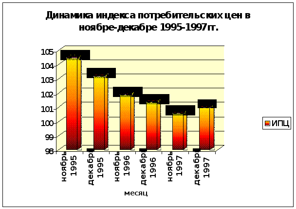 В декабре 1995г. снизился, по сравнению с предыдущим месяцем каждый из субиндексов ИПЦ: по продовольственным товарам на 0,5 процентных пункта, по непродовольственным товарам – на 1,6 процентных пункта, по платным услугам – на 3,3 (см. табл.2). Соответственно, снизился и общий уровень индекса потребительских цен на 1,3 процентных пункта. Вообще, в период с ноября 1995г. по ноябрь 1997г. наблюдалась устойчивая тенденция к понижению инфляционных процессов в России (диаграмма 2). Однако в декабре 1997г. наблюдались сравнительно более высокие темпы роста потребительских цен, которые вызвали увеличение различных предновогодних выплат и объективный рост потребительского спроса в этот период. В 1995-1996гг. его действие практически не проявлялось из-за низкой покупательной способности основной части потребителей. В 1997г. реальные доходы граждан на 2,5% превысили аналогичный показатель 1996г. В декабре 1997г по сравнению с ноябрем на 0,8 процентных пункта возрос субиндекс по продуктам питания, таким образом, основную роль в усилении инфляции в декабре 1997г. сыграл рост цен на продукты питания. 4. Методы борьбы с инфляцией. За последние 30-40 лет было испробовано много методов борьбы с инфляцией. Практически все ведущие экономисты мира сходятся в том, что инфляция очень чувствительна к резкому сокращению темпа роста денежной массы, когда в стране возникает «денежный голод». Такие методы используется обычно при стойкой инфляции, которая успела создать в стране стабильные инфляционные ожидания. Цель таких действий – заморозить совокупный спрос, что, в свою очередь, будет способствовать снижению темпов инфляции. Однако, подобные действия влекут за собой ряд негативных, но неизбежных последствий: снижение реального уровня производства и возникновение избыточной безработицы. Но во что обходится обществу сокращение темпа роста денежной массы? Неизбежной платой за успех, достигаемый на основе метода «денежного голода», становится потеря той части реально возможного благосостояния страны, которая была утеряна из-за временного спада во время антиинфляционных действий и увеличения (либо возникновения) временной избыточной безработицы. Эта плата бывает весьма ощутимой для страны даже в том случае, когда бороться приходится с относительно низкой инфляцией, порядка 8 – 12% в год. А если требуется снизить инфляцию, темп которой составляет 200 – 300% в год? Возможно ли это? Если и возможно, то на это уйдут долгие годы, в течение которых будет удерживаться очень высокий уровень безработицы. Для борьбы с инфляцией малограмотные в экономике политики часто предлагают другой метод – индексирование. Это процесс автоматической перестройки цен и зарплаты, когда зарплата автоматически повышается вслед за повышением цен. Такой метод превозносится потому, что он якобы позволяет защитить всех граждан от отрицательных последствий инфляции. Однако метод индексирования теоретически абсолютно непригоден. А на практике, чем шире его применение, тем больше он ускоряет инфляцию вплоть до момента, когда она переходит в гиперинфляцию. Гиперинфляция – это инфляция с особенно высокими темпами роста цен (обычно более 50% в месяц), при которой становятся невыгодными любое производство и даже многообразная торговая деятельность, а люди озабочены лишь тем, как побыстрее избавиться от денег, 