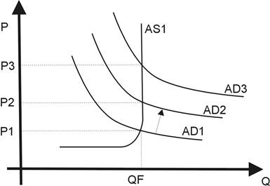 Рис. 2. Инфляция спроса [18, с. 402] Сдвиг кривой совокупного спроса вправо от AD1 К AD2 ведет к росту цен если экономика находится на промежуточном или классическом отрезке кривой совокупного предложения. Такой вид инфляции является наиболее изученным. Вычислить темп инфляции для данного года можно следующим образом: вычесть индекс цен прошедшего года из индекса последующего года, разделить эту разницу на индекс прошедшего года, а затем умножить на 100. Предотвратить инфляцию спроса можно двумя путями: во-первых, путем законодательного замораживания заработной платы; сокращения бюджетного дефицита, который может стать важным источником дополнительного спроса; ограничения массы денег в обращении; во-вторых, путем насыщения рынка товарами и услугами. Причина возникновения монетаристской инфляции: часто государство в силу неэкономических причин вынуждено идти на масштабное увеличение массы денег, производить эмиссию денег. Если наращивание массы денег не сопровождается адекватным увеличением товарной массы, то количество товара приходящегося на единицу денег сокращается, следовательно, сокращается покупательная способность денег и по определению наступает инфляция. Монетаристская инфляция наиболее часто возникает в форме обесценивания национальной валюты, т.е. внешней инфляцией. Последнее приводит к внутренней инфляции в форме инфляции издержек за счет удорожания импортируемых товаров. Умеренная (ползучая) инфляция в конкретной стране в конкретный период имеет различный диапазон, в среднем, до 10% в год. При умеренной инфляции сохраняется стоимость денег, для предпринимателей отсутствует риск заключения контрактов в текущих ценах. Считается, что умеренная инфляция стимулирует экономический рост. Умеренная инфляция переходит в галопирующую при ежегодном росте цен от 20% до сотен %. Эта инфляция вызывает беспокойство населения и предпринимателей, приводит к стремлению избавиться от денег путем покупки товаров и недвижимости с целью сохранения реальной стоимости денег. Такие высокие темпы инфляции в 80-х гг. наблюдались, к примеру, во многих странах Латинской Америки, некоторых странах Южной Азии. Гиперинфляция наступает при темпах роста цен более 50% в месяц. В Венгрии, например, после второй мировой войны индекс цен с августа 1945г. по июль 1946 г. рос в среднем за месяц на 19800%. Такой стремительный взлет инфляции возможен только при бумажном денежном обращении и неконвертируемой денежной единице, он предполагает неограниченную эмиссию денег и одновременное падение уровня производства. В связи с тем, что инфляционные ожидания – главная причина гиперинфляции, с этим трудно бороться. Можно устранить объективные предпосылки к росту цен, но они будут расти за счет исключительно ожиданий. Другая особенность гиперинфляции – быстрое сокращение реальной массы денег. Поэтому достаточно продолжительная гиперинфляция неминуемо приводит к катастрофе всей финансовой системы. Экономика не может нормально функционировать с такими темпами роста цен. Из трех функций денег средства сохранения стоимости, единицы счета, средства обращения остается только последняя, да и то относительно. Если гиперинфляцию вовремя не остановить, то она приведет к развалу экономической системы. Во всей мировой истории зарегистрировано всего 15 случаев