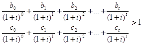 где Данная формула учитывает тот факт, что издержки могут возникать не обязательно в самом начале потока доходов. Если ожидается, что изменяются условия, влияющие на стоимость ставки процента во временном промежутке потока доходов, в этих точках могут быть использованы различные значения для ставки процента. Критерий отношения прибыли и издержек может быть полезен тогда, когда принимается решение об инвестициях в те проекты, для которых отношение текущей стоимости доходов к текущей стоимости издержек больше единицы. Уравнение этого критерия имеет вид
