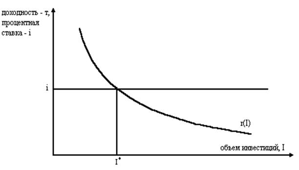 Кривая предельной эффективности инвестиций отдельной фирмы представляет собой зависимость доходности инвестиций от объема. Доходность инвестиций снижается с увеличением объема вследствие действия закона убывающей предельной производительности факторов производства. Эта кривая, характеризующая возможности фирмы по получению выгод от инвестиционной деятельности, и определяет ее инвестиционный спрос. Попробуем это обосновать. Мы выяснили, как можно изменять выгоды фирмы от инвестиций, но необходимо также ответить на вопрос – как определить издержки создания нового капитала? Независимо от того, какие средства – собственные или заемные, – использует фирма, издержками здесь является цена, которую необходимо заплатить на рынке за использование заемных средств – рыночная процентная ставка. Если предприятие использует привлеченные средства – процент принимает форму прямых издержек – платы за использование средств. Если задействуются собственные средства – процентная ставка является альтернативными издержками – упущенной выгодой от того, что инвестиционные ресурсы не предоставлены для использования другими участниками рынка. Решение фирмы об объеме инвестиций определяется, таким образом, с одной стороны – доходностью собственных инвестиционных программ, с другой – рыночной ставкой процента, то есть ценой за использование заемных средств. Это иллюстрирует Рисунок 5.2‑2: фирма будет увеличивать объем инвестиций до тех пор, пока их доходность не сравняется с рыночной ставкой процента. Рисунок 5.2 - 2