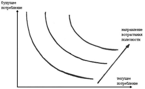 Карта кривых безразличия между текущим и будущим потреблением. И текущее, и будущее потребление естественно считать обычными благами – увеличение и того, и другого увеличивает уровень благосостояния (полезность). Предпочтения (а значит, и карта кривых безразличия) у разных людей различны. Но принцип выбора для рационально принимающего субъекта будет одним и тем же – человек выберет наилучшее для себя решение, – когда уровень его благосостояния (полезности) будет наивысшим из возможных. На рисунке 5.3‑3 это точка, где самая далекая от начала координат кривая безразличия касается межвременного бюджетного ограничения. В этой точке выполняется условие:
