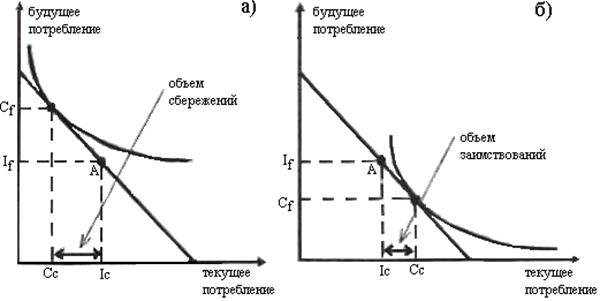 (1.1) то есть альтернативная стоимость текущего потребления, выраженная в единицах будущего потребления, равняется индивидуальной оценке его относительной полезности. Это соотношение имеет экономическую интерпретацию. Например, если MRScf>1+I, это означает, что дополнительная единица текущего потребления для человека более ценна, чем стоимость (пропорция обмена), предлагаемая рынком, и он, соответственно, сократит сбережения. В зависимости от предпочтений, человек может сберегать часть текущего дохода (рисунок 5.3‑3а), или выступать в роли заемщика (рисунок 5.3‑3б). Рисунок 5.3 - 3
