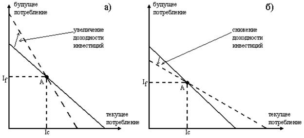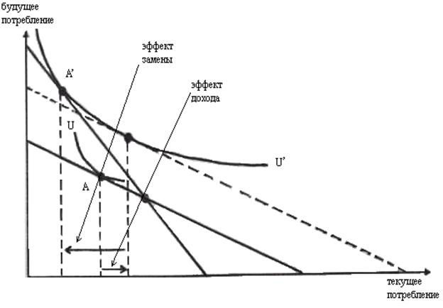 Равновесие потребителей с различными предпочтениями относительно текущего и будущего потребления: а) потребитель сберегает часть будущего дохода; б) потребитель занимает средства, увеличивая текущее потребление за счет будущего. 5.4.Влияние изменений процентной ставкиВажнейшим вопросом теории межвременного выбора является реакция человека на изменения рыночной процентной ставки. В графический модели изменение процентной ставки отображается сдвигом межвременного бюджетного ограничения относительно точки А (рисунок 5.4‑1). Рисунок 5.4 - 1