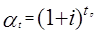 де i - процентна ставка, виражена десятеричним дробом (норматив дисконтування; tp рік приведення витрат і результатів (розрахунковий рік); t - рік, витрати і результати якого приводяться до розрахункового. При умові приведення до року початку реалізації інновацій маємо tp = 0 :