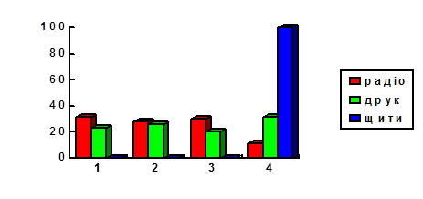 Мал.4. Структура рекламних витрат Динаміку витрат вцілому зображено на малюнку 5: Мал.5. Річна динаміка витрат на рекламу Внаслідок жорсткої конкурентної боротьби деякі фірми - оператори пейджингового зв’язку вдалися, починаючи з 1995 року до методів цінової конкуренції. В результаті, в період з 1995 по 1999 рік ціни на послуги пейджингового зв’язку впали майже у 2 рази. Так як багато операторів працювали на ринку України вже понад 2-х років (на 1995 рік), компанії “У-Пейдж” для входу на ринок необхідно було проводити зважену цінову політику. Вона полягала у тому, що поєднуючи невисокі ціни (40 у.о. в порівнянні з 45-50 у.о. в середньому) вона пропонувала високу якість обслуговування). Аналіз цінової політики компанії зображено на малюнку:
