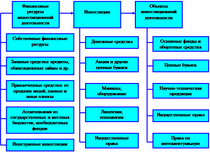 В развитой рыночной экономике ведущим инвестором является частный сектор. Российская экономика отличается значительной долей государственных инвестиций и инвестиций, основанных на смешанной собственности. Важную роль в развитии частных инвестиций играет действующий порядок их стимулирования. Он предусматривает выделение государством капитальных вложений в размере 0,5 % внутреннего валового продукта (ВВП) на финансирование высокоэффективных инвестиционных проектов, подготовленных с участием коммерческих структур, при условии их размещения на конкурсной основе. Инвестор обязан вложить не менее 80% собственных и заемных средств, включая иностранные инвестиции. Собственный капитал инвестора должен составлять не менее 20%. Объектами инвестиционной деятельности в Российской Федерации являются: Ø вновь создаваемые и модернизируемые основные фонды; Ø ценные бумаги; Ø научно-техническая продукция; Ø имущественные права; Ø права на интеллектуальную собственность Развернутая схема объектов, видов и источников инвестиций приведена на рис.1.