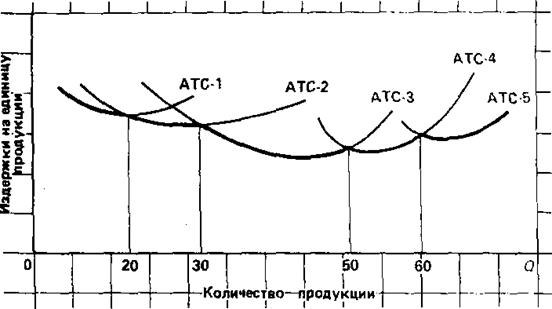 График 1. Кривая долгосрочных средних издержек: пять возможных размеров предприятия расширялось. Что будет происходить со средними общими издержками в процессе этого роста предприятия? Ответ таков. Сначала какое-то время расширение произ 12 водственных мощностей будет сопровождаться снижением средних общих издержек. Однако, в конце концов ввод все больших и больших мощностей приведет к росту АТС. На графике 1 эта закономерность проиллюстрирована применительно к пяти различным размерам предприятия. Кривая АТС-1 показывает динамику средних общих издержек для самого маленького из пяти предприятий, кривая АТС-5 — для самого большого. Соотношение между этими пятью кривыми в точности соответствует изложенному выше правилу. Строительство все более крупных предприятий будет приводить к снижению минимальных издержек на производство единицы продукции вплоть до достижения размеров третьего предприятия. Однако за этим пределом расширение производственных мощностей будет означать повышение минимального уровня средних общих издержек . Принципиальное значение имеют тонкие линии перпендикулярные горизонтальной оси. Они показывают те объемы производства, при которых предприятию следует изменить его размер, чтобы обеспечить себе возможно более низкие издержки производства единицы продукции. Посмотрим на график 1 при любом объеме производства меньше 20 единиц минимальные издержки производства единицы продукции достигаются на предприятии. Однако если объем продаж предприятия превышает 20 единиц, но меньше 30 единиц, оно сможет добиться более низких издержек производства, построив более крупное предприятие— предприятие 2. Несмотря на то что сумма общих издержек при больших масштабах производства будет большей, издержки производства единицы продукции окажутся ниже, чем прежде. При любых объемах производства в промежутке от 30 до 50 единиц наименьшие издержки производства единицы продукции обеспечит предприятие 3. При объеме производства от 50 до 60 единиц для достижения наименьших издержек следует строить предприятие 4. А при объеме производства, превышающем 60 единиц, достижение той же цели требует строительства предприятия 5. Наблюдая за этими приспособительными изменениями, можно заключить, что кривая долгосрочных АТС для отдельного предприятия состоит из участка кривых краткосрочных АТС применительно к различным размерам тех предприятий, которые могут быть построены. 13 Кривая долгосрочных средних общих издержек (АТС) показывает наименьшие издержки производства единицы продукции, с которыми может быть обеспечен любой объем производства при условии, что предприятие имело в своем распоряжении достаточно времени для проведения всех необходимых изменений в размерах предприятия. На графике жирной линией показана кривая долгосрочных АТС предприятия или как ее часто называют, кривая выбора (или плановая кривая) предприятия . Для большинства видов производства возможности выбора размеров предприятия куда шире, чем мы предположили в нашем примере. Долгосрочные кривые издержек показывают минимальные издержки производства любого данного объема продукции, когда все факторы являются переменными. Долгосрочные предельные затраты характеризуют прирост затрат при увеличении выпуска продукции на единицу, если все производс