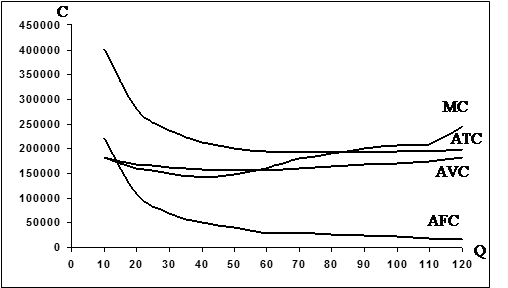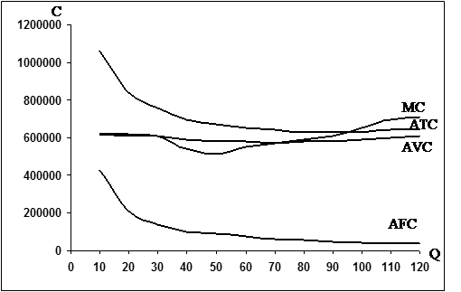 График 2.2 (б) – кривые средних и предельных издержек 25 Теперь изобразим графически взаимосвязь общих, средних и предельных издержек с объемом производства (график 2.3 а,б) на 1999 год.