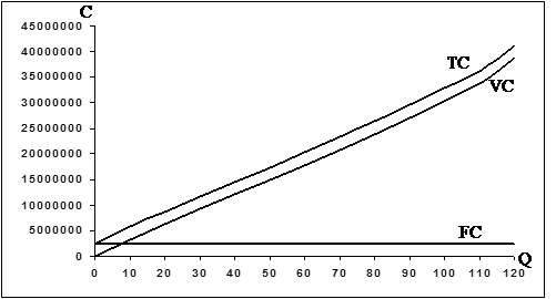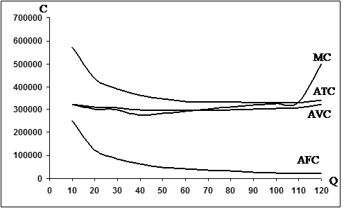 Из таблицы 2.1 видно : 1. Сумма постоянных издержек при любом уровне производства ( от 10 млн. флаконов) остается неизменной 4385501, включая нулевой показатель, т.к. величина постоянных издержек не зависит от количества произведенной продукции. 2. Сумма переменных издержек изменяется в зависимости от изменения объема производства, поэтому переменные издержки возрастают ( с 0 до 73397428) при повышении объема производства с 10 до 120 млн флаконов. 20 Однако следует отметить, что прирост суммы переменных издержек, связанный с увеличением объема производства на 10 млн флаконов, не является постоянным. В начале процесса увеличения производства переменные издержки будут какое-то время возрастать уменьшающимися темпами; и так будет продолжаться до 40 млн. флаконов. Затем переменные издержки начнут увеличиваться нарастающими темпами. Такое поведение переменных издержек обусловливается законом убывающей отдачи ( рассмотренном в первом разделе). 3. Общие издержки = постоянные издержки + переменные издержки Например, 4385541 +6276367 = 10661908 4385541+12443147=16828688 такие же расчеты производятся дальше по таблице Из таблицы 2.1. видно, что при нулевом объеме производства общая сумма издержек равна сумме постоянных издержек. Затем, при производстве каждого дополнительного количества продукции ( с 10 до 120 млн. флаконов) общая сумма издержек изменяется на туже величину, что и сумма переменных издержек. Максимальное значение общих издержек составляет 77782969 при максимальном объеме производства 120 млн. флаконов. постоянные издержки 4. Средние постоянные издержки = ------------------------------------ количество произведенной продукции Например, Как видно из таблицы 2.1.средние постоянные издержки снижаются с 438554,1 до 36546, 195 по мере увеличения объема производства с 10 до 120 млн флаконов. Это связано с тем, что средние постоянные издержки не зависят от объема производства. С ростом объема производства сумма постоянных издержек распределяется на все большее и большее количество флаконов пенициллина натриевой соли. Значит, средне постоянные издержки будут тем меньше, чем больше продукции производится на Борисовском заводе медицинских препаратов. 21 Переменные издержки 5. Средние переменные издержки = ------------------------------- Количество произведенной продукции Например, Как можно заметить, средние переменные издержки сначала снижаются, достигая своего минимального значения 579773, 33 при объеме производства 70 млн. флаконов, а затем начинают расти до 611645, 23 при производстве 120 млн. флаконов, т.к. суммы постоянных издержек подчиняются закону убывающей отдачи, то это должно отразиться на средних переменных издержках, рассчитываемых на их основе. На стадии возрастающей отдачи все меньше и меньше дополнительных переменных ресурсов требуется для производства каждого из 70 первых миллионов флаконов. В результате происходит снижение переменных издержек в расчете на единицу продукции. При производстве 80 других миллионов флаконов средние переменные издержки начнут возрастать, поскольку убывание отдачи обусловит необходимость использования большего и большего количества переменных ресурсов.6. Средние средние средние общие издержки общие = постоянные + переменные = ---------------------- издержки издержки издержки количество производимой продукции