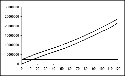 Можно сделать вывод, что предельные издержки сначала снижаются, достигая своего минимума 516402,8 при объеме производства 50 млн. флаконов, а затем возрастают. Это отражает тот факт, что переменные издержки сначала растут убывающими, а затем нарастающими темпами. Аналогично рассчитываются таблицы 2.2 и 2.3. 1. постоянные издержки по препарату пенициллина натриевая соль постоянны, т.к. они не зависят от объема производства. 2. переменные издержки возрастают при увеличении количества произведенной продукции. 3. также нужно отметить, что сумма общих издержек повышается при увеличении объема производимой продукции. 4. поскольку сумма постоянных издержек не зависит от объема производства, то ,следовательно, средние постоянные издержки падают по мере увеличения объема. 5. можно заметить (см. таблицу 2.2), что средние переменные издержки с увеличением объема производства до 60 млн. флаконов снижаются до уровня 295857,43 а затем возрастают при дальнейшем увеличении объема производства; по таблице 2.3. средние переменные издержки сначала падают, достигая своего минимального значения 156580,34 при объеме производства 50 млн. флаконов, а затем начинают расти, достигая максимального значения 181211,2 при объеме производства 120 млн. флаконов. 6. можно сказать ( см. таблицу 2.2.) о снижении предельных издержек при увеличении объема производства, достигая минимального значения 275214,3 при производстве 40 млн. флаконов, затем значительно возрастают и достигают максимального значения 500427,3 при производстве 120 млн. флаконов; из таблицы 2.3 видно, что предельные издержки сначала снизились до 141325,7 при объеме 40млн. 23 флаконов, а потом постепенно стали возрастать, достигая максимального значения 244537,5 при объеме производства 120 млн. флаконов. Теперь изобразим графически взаимосвязь общих, средних и предельных издержек с объемом производства 1997 г. (график 2.1 а,б )