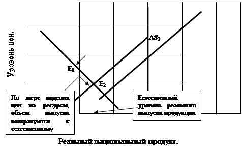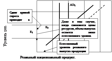 Кейнс считал, что сбережения не изменяются при изменении величины процентной ставки. Поэтому кривая сбережений у Кейнса совершенно неэластична. Он полагал также, что инвестиции гораздо менее эластичны по отношению к изменениям процентной ставки, чем предполагали классики, однако он никогда не утверждал, что инвестиции совершенно неэластичны. На графике реальные плановые инвестиции равны по объему реальным сбережениям в точке Е1 (пересечение кривых PI1и SS1). Если кривая плановых инвестиций сместится влево и займет положение PI2 (а подобное может произойти в период депрессии), то процентная ставка просто не сможет спуститься до величины настолько малой, чтобы уравнять плановые инвестиции и сбережения при условии, что национальный продукт и доход останутся на естественном уровне. Равновесие может быть восстановлено при положительной величине процентной ставки только в том случае, если произойдет сокращение национального дохода и продукта, что приведет к смещению кривой сбережений влево до положения SS2. Критика механизма гибких цен.Подвергнув сомнению эффективность действия механизма гибких процентных ставок, Кейнс обратился к проблеме гибких цен. Он признавал, что падение совокупного спроса вызывает скольжение всей экономической системы вниз – влево вдоль кривой совокупного предложения, имеющей положительный наклон. Это непременно сопровождается снижением цен, сокращением реального выпуска и ростом безработицы (падением занятости). Однако Кейнс был категорически не согласен с утверждением классиков о том, что длительное снижение цен на ресурсы и готовую продукцию возвратит реальный выпуск к его естественному уровню. В качестве доказательства правильности своей позиции он использовал два главных аргумента: неизменность (регидность) заработной платы и наклон кривой совокупного спроса. Неизменность заработной платы.Первое утверждение Кейнса было о том, что заработная плата, являющаяся важнейшим видом цен на ресурсы, изменяется в сторону понижения отнюдь не с той легкостью и простотой, как того бы хотелось представителям классической школы. Действительно, рабочие иногда соглашаются на понижение их номинальной заработной платы. Такое в 1930 –х годах случалось, и неоднократно. Однако подобные действия предпринимателей наталкивались на мощное сопротивление трудящихся, которое принимало форму забастовок и разного рода акций протеста. Это сопротивление было настолько сильным, считал Кейнс, что в качестве рабочей гипотезы целесообразнее исходить из допущения о совершенной регидности заработной платы, подразумевая фактическую невозможность ее понижения, нежели предполагать, что заработная плата обладает абсолютной гибкостью. Так как заработная плата составляет весьма значительную часть всех цен на ресурсы, то и цены остальных ресурсов следует признать негибкими, их снижение также маловероятно. Даже при наличии негибких цен на ресурсы, полагал Кейнс, средний уровень цен на готовую продукцию все равно будет падать, если совокупный спрос сокращается. В условиях регидности заработной платы кривая совокупного предложения на долгосрочных временных интервалах совпадает для данной экономической системы с краткосрочной кривой совокупного предложения. В условиях падения совокупного спроса экономическая систе