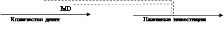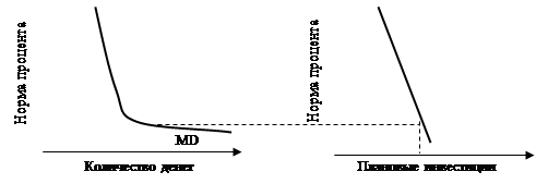 Часть а рисунка 4 иллюстрирует совокупность условий, существование которых предполагал Кейнс. Изображенная здесь кривая спроса на деньги при низкой норме процента имеет горизонтальный «хвост», а график плановых инвестиций представляет собой почти вертикальную линию. Слабость передаточного механизма при этих обстоятельствах обуславливает два вывода для экономической политики. Во-первых, она означает, что снижение уровня цен окажет незначительное воздействие на совокупный спрос. Падение уровня цен при постоянном реальном национальном доходе подразумевает уменьшение величины номинального национального дохода. Как показано в части б рисунка, такое уменьшение номинального национального дохода будет сдвигать кривую спроса на деньги влево из положения MD1 в MD2. Однако вследствие предполагаемого вида этой кривой едва ли ее сдвиг отразится существенным образом на значении нормы процента. При условии неэластичности графика плановых инвестиций возможное увеличение их реального объема может быть лишь весьма незначительным. Если падение уровня цен не оказывает воздействия на плаговые инвестиции, то как было показано на рисунке 2, кривая совакупного спроса займет вертикальное или почти вертикальное положение. Это означает, что экономическая система не обладает никакой “встроенной” в нее способностью восстанавливаться после депрессии. Во-вторых, слабость передаточного механизма подразумевает, что экспансионистская денежно-кредитная политика малопригодна для восстановления экономической системы в постдепрессионный период. Попытка объяснения создавшегося положения вещей приводится в части в рисунка 4. Сдвиг кривой положения денег из MS1 и MS2 не оказывает почти никакого воздействия на норму процента. В той степени, в какой имеет место некоторое снижение нормы процента, воздействия на плановые инвестиции является столь незначительным, что им вообще можно пренебречь. Следовательно, слабость передаточного механизма означает одновременно следующее: экономическая система не обладает способностью самопроизвольно восстанавливать свой потенциал после депрессии, экспансионистская денежно-кркдитная политика не способствует восстановлению экономики в постдепрессионный период. Из этих рассуждений логически следует, что только экспансионистская налогово-бюджетная политика может спасти экономическую систему от длительной и тяжелой депрессии. Схема: Кейнсианская теория предпочтенияликвидности