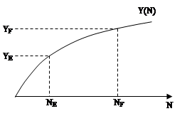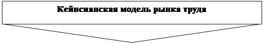 Y(N) – производная функция. На оси ординат откладывается значение равновесного дохода YF, проводится прямая, параллельная оси абцисс, и из точки ее пересечения с кривой Y(N) опускается перпендикуляр к оси абцисс. Уровень занятости, соответствующий доходу YF, равен NF. Величина NENF дает меру безработицы. В концепции Кейнса главным, решающим фактором формирования занятости выступали инвестиции. Во-первых, в силу действия «основного психологического закона» вместе с ростом уровня доходов уменьшается склонность к потреблению и увеличивается склонность к сбережению. Поэтому инвестиции должны расти таким образом, чтобы заполнить разрыв в эффективном спросе, вызванный ростом сбережений, поскольку в противном случае занятость и объем производства сократятся. Во-вторых, именно прирост инвестиций вызывает кумулятивный рост доходов и занятости. Инвестиции, способные обеспечить полную занятость или приближения к ней, имеют некоторые особенности. Такие инвестиции направлены не на расширение существующих производственных мощностей и не на вовлечение дополнительного объема факторов производства, а на более полное использование имеющихся. Далее, поскольку инвестиции должны обеспечить реализацию той части реального национального дохода, которая не была потреблена, то соответствующий спрос может исходить только из инвестиционного сектора экономики. В то же время мультипликационным эффектом в отношении доходов и занятости обладают не только инвестиции, направленные в общественный сектор экономики, которые вообще не связаны с производством. Наконец, инвестиции, обладающие мультипликационным эффектом, являются по своему характеру автономными, т.е. осуществляются не в связи с общим ростом доходов, а за счет государственных (общественных) расходов. К расширению занятости в условиях неполного использования производственных факторов в принципе может привести и увеличение количества денег. Однако, поскольку это происходит, прежде всего, через действие нормы процента и инвестиций, то реальные возможности влияния кредитно-денежной политики на уровень совокупного спроса и занятость ограничены. Решающая роль инвестиций в деле расширения занятости свидетельствует о том, что политика стимулирования потребительского спроса в целях увеличения совокупного спроса и занятости ограничены. Схема: Кейнсианская модель рынка труда