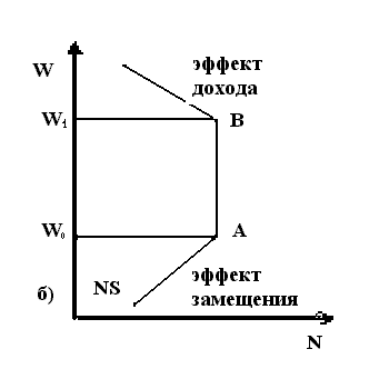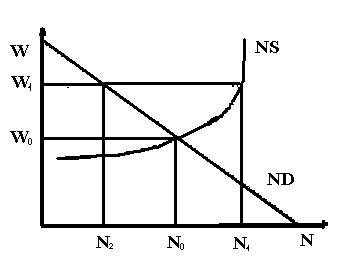 Рис. 3. Определение спроса на труд в классической концепции В коротком периоде спрос на труд может измениться только вследствие изменения ставки реальной зарплаты. В длительном периоде спрос на труд может меняться под влиянием технологических факторов. Рост количества применяемого капитала при заданной технологии и повышение эффективности технологии приведут к сдвигу кривой спроса на труд вправо. Предложение труда Предложение труда находится в прямой зависимости от ставки реальной зарплаты, при этом предложение труда абсолютно эластично к изменению ставки зарплаты. NS = f(w, + ). (10) Соответственно, графически функция предложения труда может быть представлена в виде кривой с положительным наклоном, в системе координат (w, N). Этот достаточно очевидный вывод нуждается в некотором комментарии. На мотивацию поведения отдельного субъекта на рынке труда оказывает влияние его стремление сделать некоторый оптимальный выбор между трудом и досугом. При этом, однако, проявляются два эффекта, причем действующие в противоположном направлении: эффект замещения и эффект дохода. Эффект замещения проявляется в том, что рост заработной платы создает стимулы для увеличения рабочего времени и занятости, в результате чего предложение труда растет. Эффект дохода заключается в том, что при определенном уровне дохода появляется стимул сокращать рабочее время, в результате чего рост зарплаты будет сдерживать предложение труда. Тогда возникает вопрос: почему кривая предложения труда имеет положительный наклон, а не является вертикальной или ломаной линией. Так, если предположить, что до определенного момента, например, до достижения заработной платой значения w0, действует только эффект замещения, в интервале значений зарплаты w0 – w1 действуют оба эффекта, а после достижения зарплатой значения w1 действует только эффект дохода, то кривая предложения труда примет вид, представленный в правой части рис. 4. Наиболее распространенное объяснение положительного наклона кривой предложения труда заключается в том, что на рынке труда оба эффекта действуют одновременно, причем эффект замещения проявляется значительно сильнее, нежели эффект дохода, так как эффект дохода действует только в отношении занятого населения, эффект же замещения способствует увеличению экономически активного (самодеятельного) населения. Однако с ростом заработной платы действие эффекта дохода усиливается, а эффекта замещения снижается, что проявляется в снижении эластичности предложения труда к изменению заработной платы. Так как предложение труда зависит от ставки реальной зарплаты, то рост цен приводит к снижению реальной заработной платы, следовательно, и предложения труда. Равновесие на рынке труда Равновесие на рынке труда достигается при условии, что все предложение труда полностью поглощается спросом предпринимателей на труд. ND(w,-)=NS(w,+). (11) Согласно неоклассической концепции равновесие на рынке труда всегда устанавливается при полной занятости, чему способствует гибкость номинальной ставки зарплаты. То есть в каждый момент времени любой желающий может продать труд по сложившейся ставке зарплаты, а нежелание работать рассматривается как добровольная безработица.