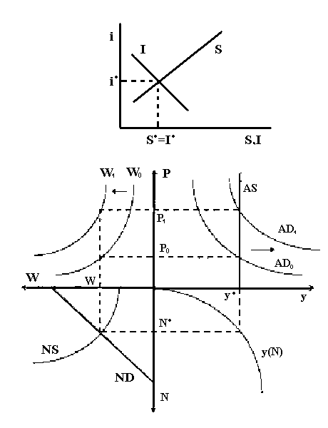 Рис. 6. Общее экономическое равновесие в классической концепции Равновесное значение у' определяет функцию совокупного 1редложения. Функция совокупного спроса выводится из количественного уравнения обмена: у = (Mv)/P. Изменение количества денег влияет только на номинальные переменные, изменяя текущий уровень цен Р. Соответственно графики AD и W сдвигаются от начала координат при росте денежной массы и наоборот при ее уменьшении. В верхней части рисунка отображен процесс формирования условий равновесия на рынке капитала, где устанавливается равновесная процентная ставка. Итак, формирование условий ОЭР в классической модели происходит по принципу саморегулирования, без вмешательства государства, что обеспечивается тремя встроенными стабилизаторами: гибкими ценами, гибкой номинальной ставкой зарплаты и гибкой ставкой процента. При этом денежный и реальный сектор независимы друг от друга. Заключение В рыночной системе функционирует специфический рынок – денежный (финансовый) рынок. Механизм этого рынка поддерживает макроэкономическое равновесие. На денежном рынке (как и на других) формируется цена, специфической ценой является ставка процента – рыночная цена на ресурсы. Так, если предположить, что по каким-либо причинам в экономике происходят сбережения, то это приведёт к тому, что будут расти вклады в сберегательных банках. Люди хранят деньги не наличными, а в банке, из-за процента. А это приведёт к тому, что увеличится количество денежных ресурсов в банках, что в свою очередь приведёт к кредитованию населения (ссуды). Банки увеличат предложение на финансовом рынке, а это вызовет снижение ставки процента, т.е. снизится цена. Это приведёт к тому, что предприниматели будут больше и чаще брать ссуду в банке, что приведёт к увеличению инвестиций, ибо предприниматели прибегают к ссудам ради реализации инвестиционных проектов. А инвестиции – это расходы. Поэтому через механизм денежного рынка сбережение трансформируется в инвестиции, а процентная ставка и есть механизм, изменяющий рост сбережений и инвестиций. Сокращение сбережений вызовет снижение кредитования, значит снизится предложение, что вызовет увеличение денежной ставки, а это вызовет некоторое свёртывание инвестиций на рынке. Однако, если по каким-либо причинам механизм эластичной процентной ставки поддерживать рыночное равновесие не может, то делу помогут изменяющиеся цены и заработная плата. Если предположить, что в экономике часть продукции не находит сбыт, то это будет побуждать продавцов к снижению цены, а это позволит реализовать всю продукцию, ибо объём продукции будет сильно нарастать, что грозит серьёзными потрясеньями и наоборот. Также гибкими является заработная плата. Если предположить, что в экономической системе затруднение с реализацией товаров и услуг, в этом случае цена снизится, однако потребуется также и снижение издержек следующим образом. Работодатели обратятся к наёмным работникам: «Либо Вы согласитесь на некоторое снижение заработной платы либо мы будем вынуждены часть работников уволить». По мнению классической школы работники выберут первое. И наоборот. И так, можно подвести итог. Гибкие процентные ставки, заработная плата, цена позволяют по мнению представителей классической школы поддерживать равновесие в рыночной системе, ч