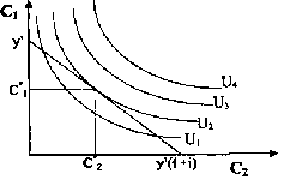 Рис. 1. Эндогенное определение уровня дохода путем распределения календарного времени на рабочее и свободное и максимизации полезности Проекция из точки касания линии бюджетного ограничения одной из кривых безразличия и позволяет определить оптимальный уровень дохода у' и, соответственно, — количество рабочего времени N', необходимого для его достижения. Достижение субъектом более высокой кривой безразличия, и соответственно — уровня полезности возможно лишь при изменении экзогенно заданных параметров: ставки реальной заработной платы и известного на текущий момент дохода от имущества. Повышение ставки заработной платы изменяет наклон линии бюджетного ограничения, делая ее круче. Повышение величины дохода от имущества сдвигает линию бюджетного ограничения вверх. Таким образом мы получили ответ на вопрос о порядке формирования уровня дохода субъектом в текущем периоде исходя из заданных параметров величины и доходности имущества. Однако величина имущества в текущем периоде определяется сбережениями, сделанными в предыдущем периоде. Поэтому перед субъектом стоит задача оптимального распределения текущего дохода между потреблением и сбережением. Для этого необходимо произвести дисконтированную оценку потоков дохода и потребления и фонда сбережений. В качестве нормы дисконта выступает ставка процента. В целях упрощения представим, что жизненный цикл субъекта разделяется на два периода. В первом периоде субъект получает трудовой доход, распределяя его на потребление и сбережение, во втором периоде получает трудовой доход и доход от имущества, сформированного в результате сбережений, и полностью его потребляет. Тогда бюджетное ограничение первого периода можно выразить: y1=C1+S1 Бюджетное ограничение второго периода: y2+S1(1+i)=C2 Выразив из первого уравнения S1 и подставив его значение во второе уравнение, получим двухпериодное бюджетное ограничение: y1+y2/(1+i)=C1+C2/(1+i) (3) где Сt — потребление в периоде t; уt — доход в периоде t; i — ставка процента. Левая часть выражения (3) представляет дисконтированную оценку доходов, правая — дисконтированную оценку величины потребления в обоих периодах. Обозначим левую часть уравнения (3), то есть дисконтированный поток дохода, как у' и представим его в виде: C2/(l+i)=y'-C1. (4) Уравнение (4) показывает нам все возможные варианты распределения потребления между двумя периодами. Нетрудно заметить, что данное распределение зависит от текущей процентной ставки: чем выше ставка процента, тем предпочтительней будущее потребление, чем меньше ставка процента, тем предпочтительней текущее потребление, то есть текущая ставка процента выражает меру предпочтения субъектом текущего потребления будущему. Теперь субъекту остается лишь оптимизировать распределение потребления между двумя периодами в соответствии с полученным бюджетным ограничением. Процесс оптимизации наиболее наглядно можно проиллюстрировать графически, что отражено на рис. 2. Нисходящей прямой представлена бюджетная линия, построенная на основе уравнения (4): в первом периоде максимальный объем потребления составляет у', а во втором у'(1+i).