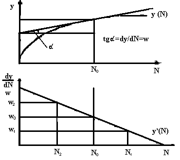 В нижней части рисунка на основе убывания tg построен график предельной производительность труда y'(N), которая и будет графическим выражением функции спроса на труд. При экзогенно заданном значении заработной платы определение спроса на труд сводится к совмещению графиков реальной зарплаты и предельной производительности. Так, при ставке зарплаты w0 проекция пересечения графика w0 с графиком y'(N) укажет на оптимальную занятость в размере N0. При снижении ставки реальной зарплаты до w, оправданно будет повышение занятости до N1, a при повышении ставки зарплаты до w0 занятость снизится до N2.