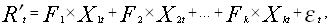 В результате описанной процедуры, вместо случайного множества ценных бумаг, мы получаем набор упорядоченных кластеров, объединенных на основе общих тенденций в динамике доходности. При этом достигаются сразу две важные цели: во-первых, значительно сокращается количество переменных, что в заметной степени упрощает вычисления, а во-вторых, уменьшается доля воздействия случайных факторов, которые могут в отдельные моменты коррелировать с доходностью отдельных ценных бумаг. В рамках кластера за счет произведенной диверсификации вероятность случайных совпадений уменьшается во много раз, что дает возможность гораздо более ясно определить факторы, реально воздействующие на доходность. 2. Определение факторов, влияющих на доходность составляющих каждого кластера. Расчет факторных весов. Построение уравнения регрессии. Для того, чтобы вычислить величину влияния каждого фактора на соответствующий кластер ценных бумаг, представим доходность по кластерам в следующем виде: