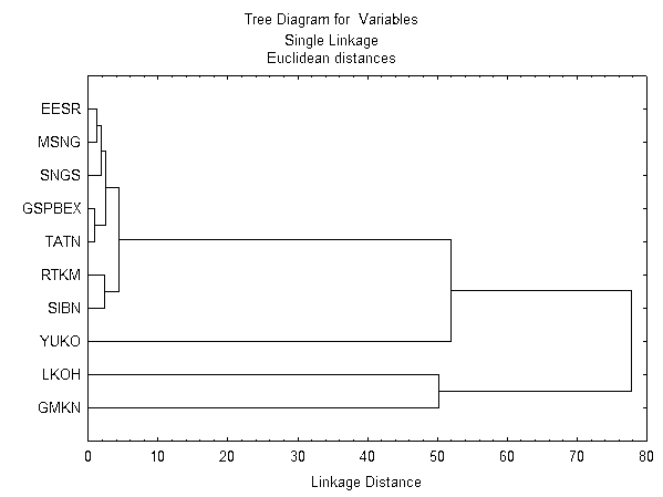 Как уже отмечалось, в случае необходимости добавляется условие не отрицательности долей mi. Вывод: полученная задача легко решается как при помощи стандартно используемых вычислительных методов, так и большинством математических и экономических программных пакетов (MathCAD, SAS, Solver for MS Excel и т.д.). 4. Кластеризация «голубых фишек» российского фондового рынка В данном разделе проведен анализ наличия кластеров наиболее ликвидных акций российского рынка. Результаты кластеризации отражены на рис. 2. Т.к. данный анализ построен на корреляции переменных, то мы видим, что наиболее близкие друг другу переменные это РАО ЕЭС (EESR), Мосэнерго (MSNG), Сургутнефтегаз (SNGS), Газпром (GSPBEX) и Татнефть (TATN). То есть на протяжении больше чем одного года, котировки данных акций кореллировали друг с другом, причем очень сильно. Учитывая, что это происходило в прошлом, скорее всего так будет и в будущем. Следующий кластер - Сибнефть (SIBN) и Ростелеком (RTKM).Также очень зависимы друг от друга. Рис. 2 «Результаты кластеризации».